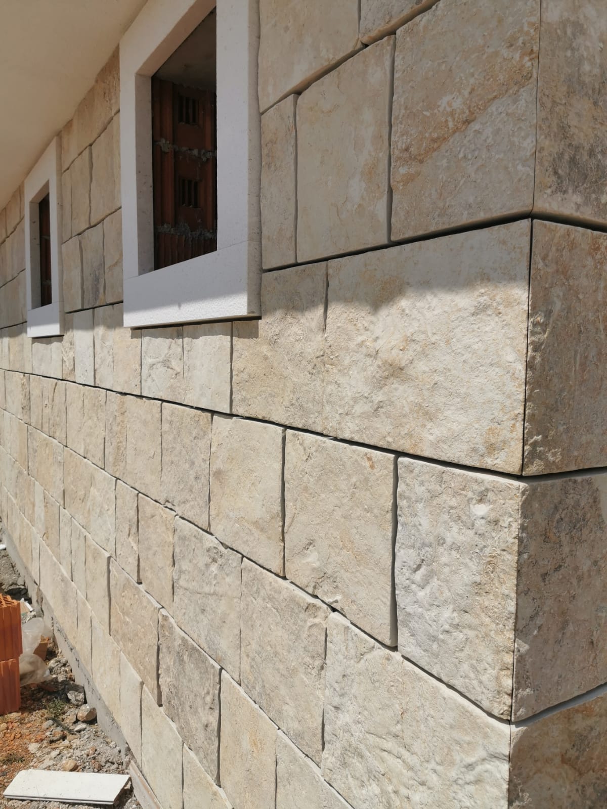 Jest to naturalny kamień dekoracyjny. Składa się z otaczanych płytek, które mają 4 boki cięte(lekko zaoblone), lico odbijane. Grubość kamienia to ok 2-3cm, długości od 10 do 45cm, natomiast wysokości wahają się w przedziale 3-30cm. Warto wybrać dwie lub maksymalnie 3 wysokości aby stworzyć mozaikę jak na poniższym zdjęciu.